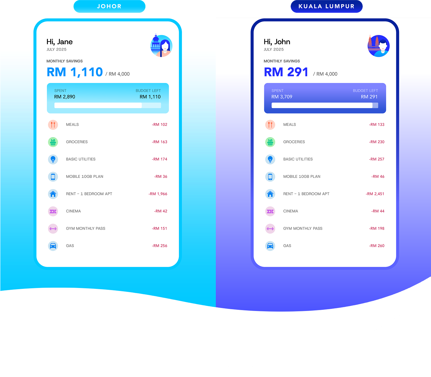 Johor isn’t just moving forward. It’s moving smarter. While cities like Kuala Lumpur and Singapore come with steeper costs, Johor offers a rare equilibrium: premium salaries of RM4,000–RM5,000, lower living expenses, and growing access to regional and global markets. Malaysia’s new Basic Expenditure for Decent Living (PAKW) indicator—which measures what households truly need for quality living rather than bare survival—reinforces this advantage by providing district-level cost assessments that highlight regional opportunities.Monthly Living Expenses between Johor and KL